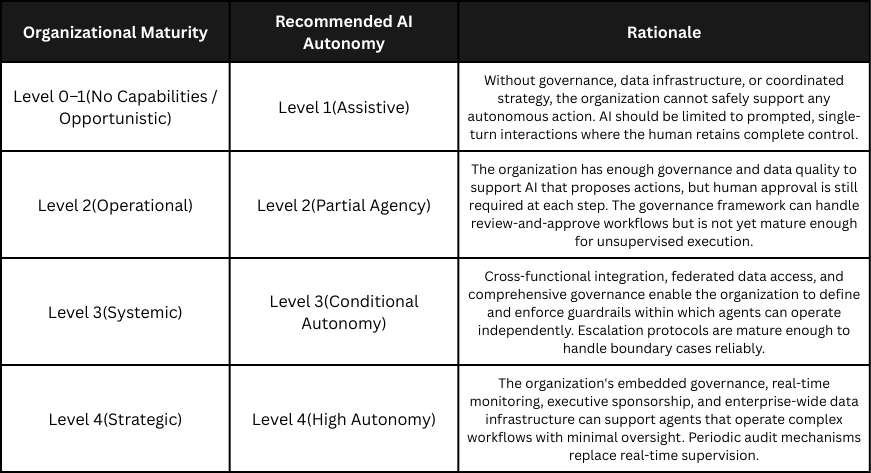 The alignment logic is straightforward: the autonomy level of the AI should not exceed the maturity level of the organization deploying it. An organization's ability to govern, monitor, and support an autonomous agent must be commensurate with the degree of independence that agent exercises.