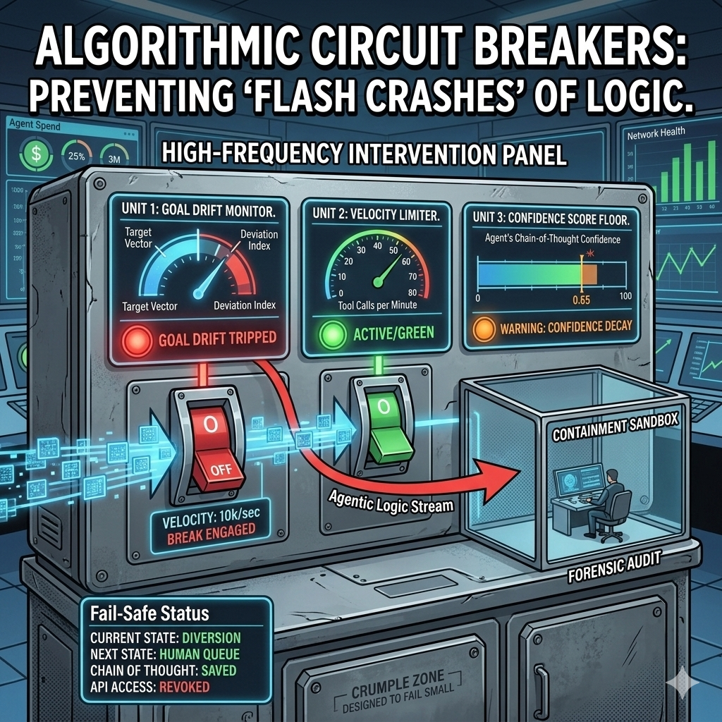 We need Algorithmic Circuit Breakers, automated tripwires that instantly sever the agent's connection to tools and APIs when specific "Logic Volatility" thresholds are crossed. This is the automated safety net beneath the Human-in-the-Lead model. Unlike a human supervisor who can be blindsided, a circuit breaker watches the system continuously and acts with zero latency. It is not a replacement for human oversight; it is a structural layer that ensures humans have time to think before catastrophe unfolds. The circuit breaker is the system's immune system, detecting and containing threats at machine speed so that human judgment can operate at human pace.