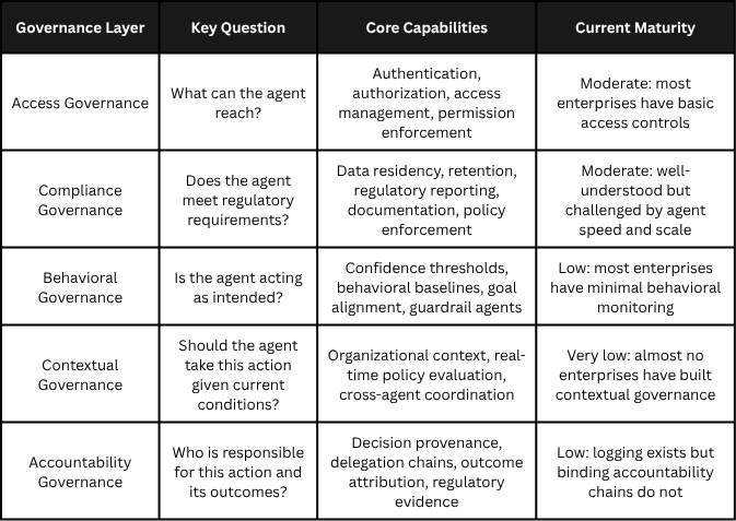 The problem is not that enterprises lack security and compliance controls for their agents. The problem is that they are treating security and compliance as if they were governance. They are not the same thing. Security answers the question: is this agent protected from threats? Compliance answers the question: does this agent meet regulatory requirements? Governance answers a broader set of questions: should this agent be taking this action, under these circumstances, with this level of autonomy, given the current business context, risk posture, and organizational policy? Security and compliance are components of governance. They are not substitutes for it.
