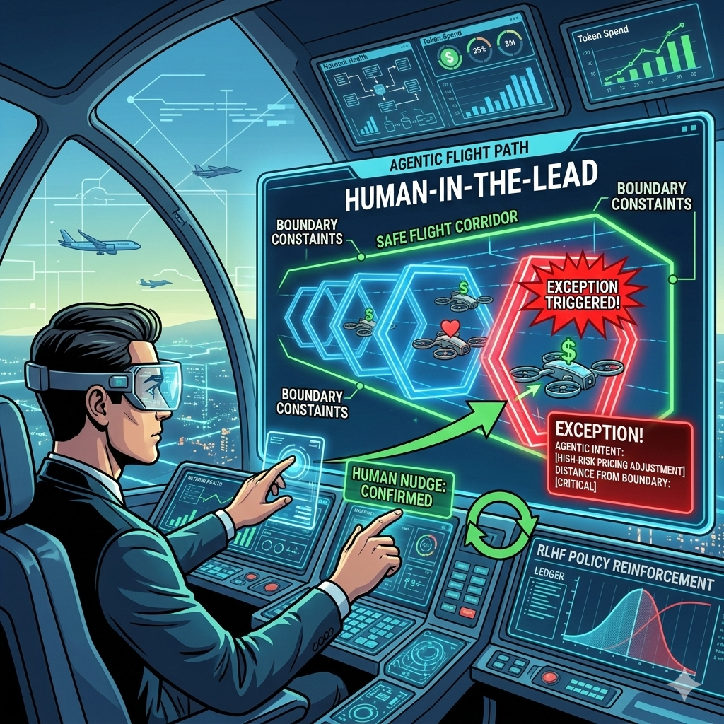 Air Traffic Controllers do not micromanage each plane's throttle or flaps. They do not require call-in approval for every altitude change. They do not read the pilot's logs on every descent. They set corridors, assign headings, manage separation, and intervene only when separation is violated or weather changes. They trust the system and the training. This is exactly how Human-in-the-Lead works for agents. The human sets the lane. The agent drives within it. Intervention happens only at boundaries. The human sleeps soundly because the architecture does the work of staying safe.