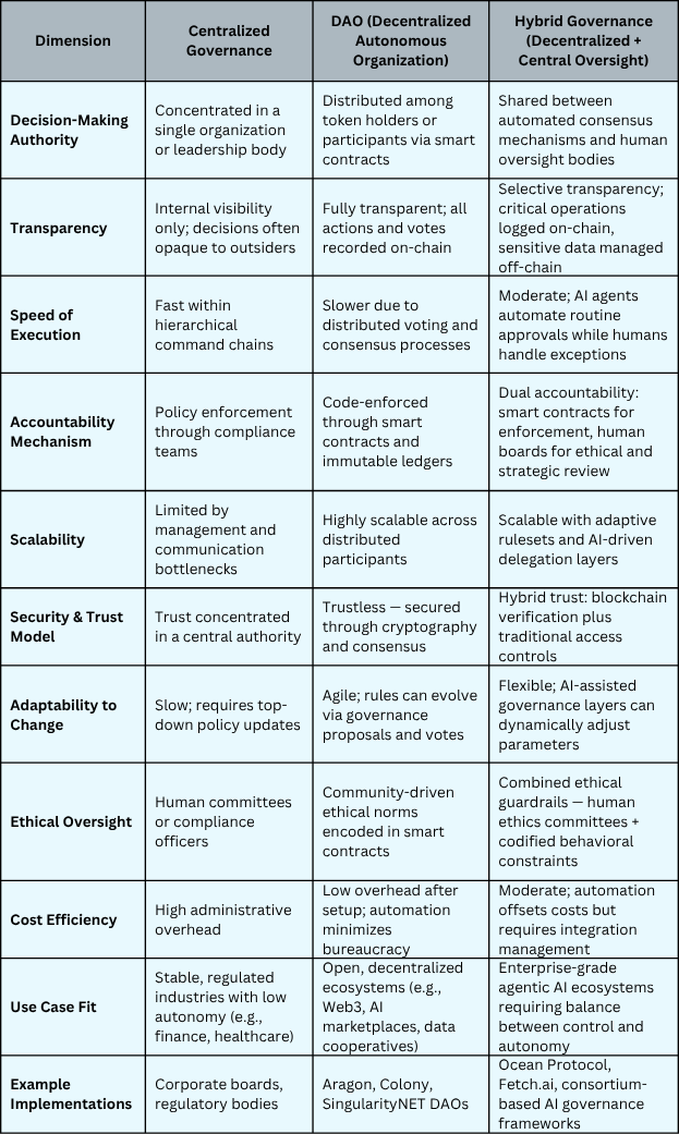The solution may lie in a radical rethinking of governance itself. Decentralized governance models rooted in blockchain technology, Decentralized Autonomous Organizations (DAOs), and distributed consensus mechanisms offer a new paradigm for managing autonomy, transparency, and collaboration in agentic ecosystems.