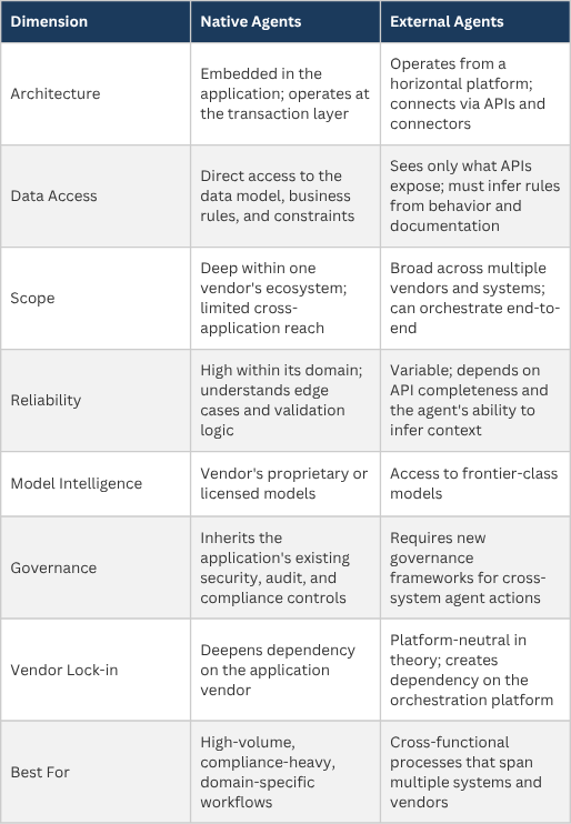 This creates a strategic choice that every enterprise technology buyer and vendor needs to confront: do you bet on native agents that are deeply embedded in specific applications, or external agents that operate across applications from a horizontal platform? The answer is not obvious, and getting it wrong has real consequences for cost, flexibility, and competitive positioning.