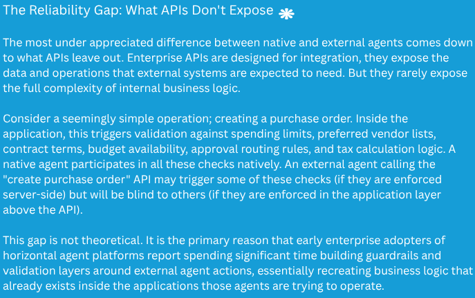 The limitation is depth. An external agent interacting with an ERP system through an API sees only what the API exposes. It does not have direct access to the validation rules, the business logic, or the transactional boundaries that native agents operate within. If the API does not expose a particular rule or constraint, the external agent does not know about it. This creates a reliability gap: the external agent may attempt actions that violate business rules it cannot see or miss edge cases that a native agent would handle automatically.