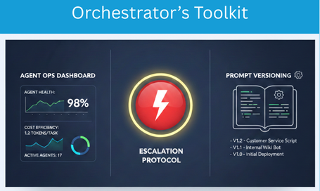 The probationary period. Every new agent deployment should begin with a "Human-in-the-Loop" phase. During this window, the Orchestrator monitors outputs, corrects drift, and fine-tunes the agent's behavior. This is not a set-it-and-forget-it exercise. It is active management, requiring pattern recognition, contextual judgment, and a willingness to intervene when the agent's outputs miss the mark.