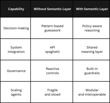 Two procurement agents receive the same purchase request: "Order 500 units of Product X from the approved supplier list." The first agent; operating without semantic grounding; searches by keyword, finds a vendor match, and places the order. The second agent, equipped with a semantic layer, cross-references the product specification against compliance requirements, verifies the supplier's certification status has not expired, and checks whether the quantity aligns with current inventory policy thresholds. Only one makes the right decision.