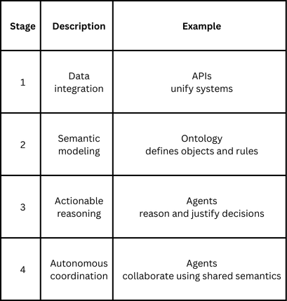 Most enterprises are still in Stage 1, focused on getting systems talking to each other at the data level. A growing number are moving into Stage 2, building formal ontologies and taxonomies. Stage 3, where agents actually use semantic models to reason, is emerging now. Stage 4 remains largely aspirational, but the architectural pieces are coming together.